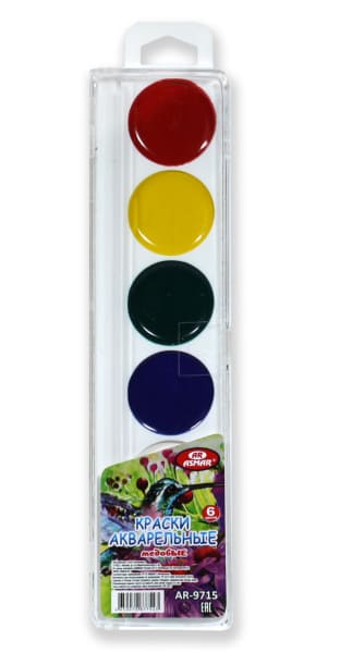 —Акварельные краски 6 цв, медовые, пласт. уп., европодес, без кисти, AR-9715